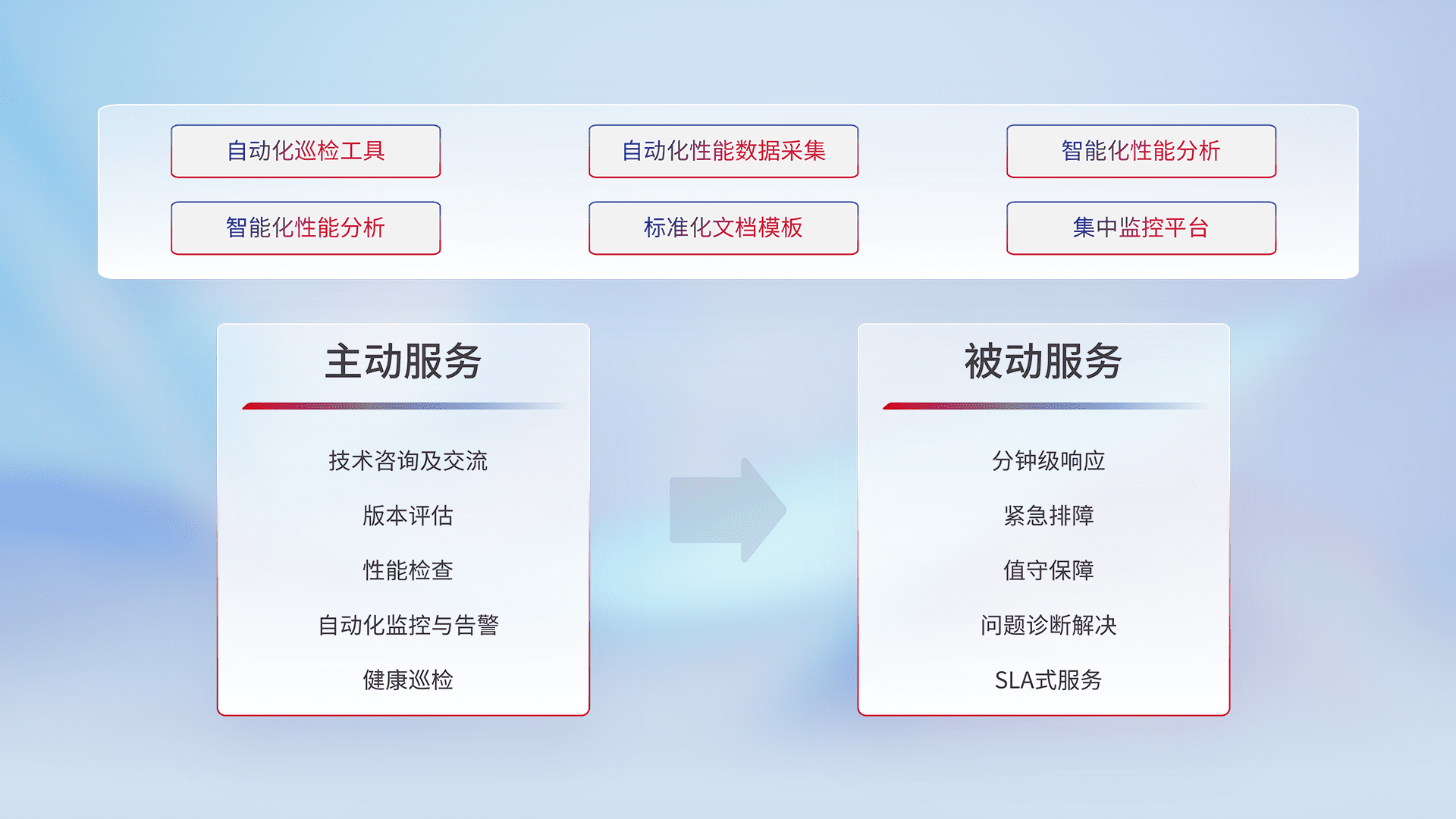 智能化工具和标准化文档,,,保障服务质量,,,提供主动服务(包含技术咨询、、、版本评估、、、、性能检查、、、自动化监控与告警、、健康巡检)和被动服务包含(分钟级响应、、紧急排障、、值守保障、、、、问题诊断解决、、、SLA服务)。。。。